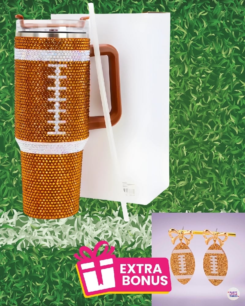 Cheer on your favorite team while hydrating. This bling'd out foot ball design tumbler lets you do it is diva fashion.